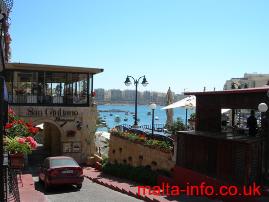 The seafront on the north side of Spinola Bay is packed with restaurants.
