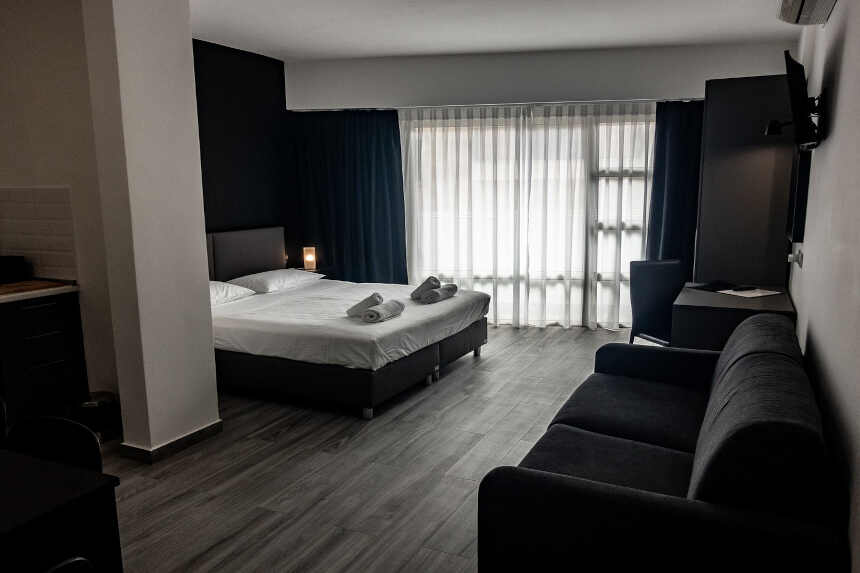 - The studios are double rooms equipped with a kitchen/dining room combination plus en suite bathroom with shower. Room facilities include kitchenette, coffee machine, toaster, flat screen T.V with 16 international channels, air-conditioning/heating units and free WIFI. Each studio can accommodate up to 3 people.